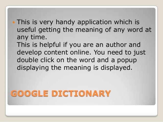 Google dictionary application. Users simply need to click on any word when serving the web using the google chrome browser and they will be supplied with the definition for this special add on dictionary almost instantly. Google dictionary is a google chrome extension developed by google inc. For windows mac and linux based computers that enable users to view definitions while web browsing.