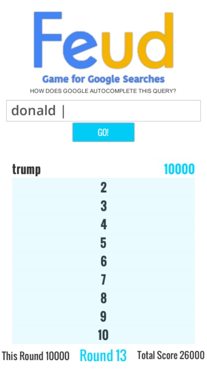 Google feud game. Your goal is to correctly guess at least three of the most popular ones for topics ranging from culture to history. Google feud is a google guessing game with the same quiz style as family feud. You have to guess the top 10 most common queries based on a partial search phrase.
