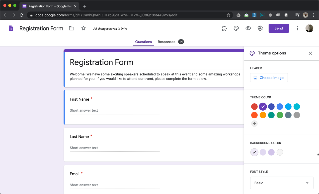 Its a great way to make your form look professional and on brand. By default your form will be purple. Click the color palette button in the top right corner and click the image icon.