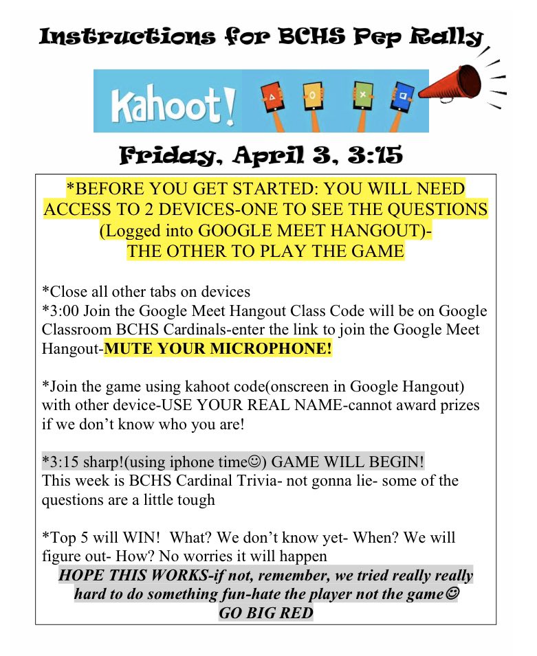 Bridge City Hs V Twitter You Are Invited To Our First Ever School Wide Kahoot Palooza Friday Pep Rally Time 3 15 Instructions Here Code To Join Google Meet Will Be Shared