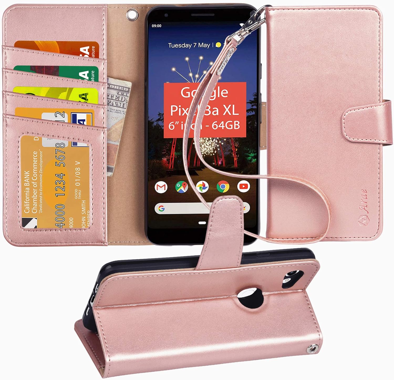 Amazon Com Arae Pixel 3a Xl Case Pu Leather Wallet Case For Google Pixel 3a Xl With Wrist Strap And Id Credit Cards Pocket Rosegold Electronics