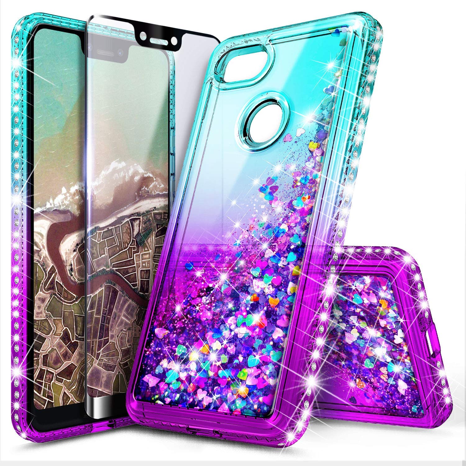Amazon Com Nagebee Case For Google Pixel 3a Xl Glitter Liquid Floating Bling Sparkle Waterfall Girls Women Cute Protective Phone Case With Tempered Glass Screen Protector Full Coverage Aqua Purple Electronics