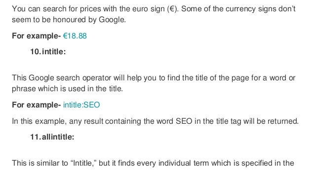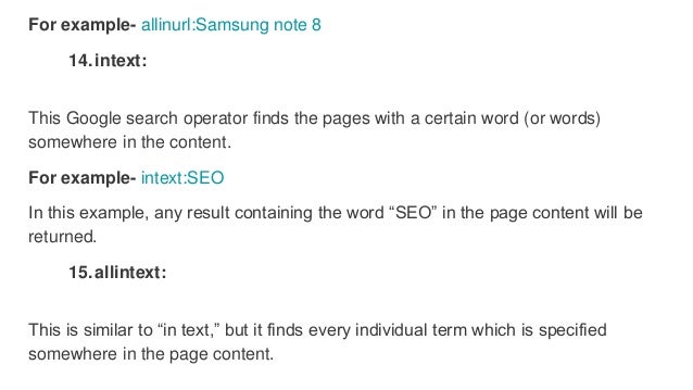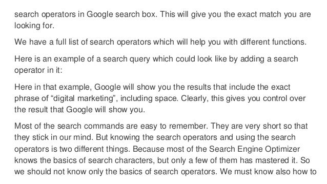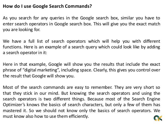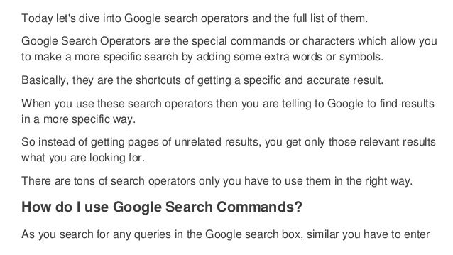 Google provides many advanced search operators and commands that can help you gain powerful insights and find new seo opportunities. For this post i personally tested every search operator i could find. Here is a complete list of all working non working and hit and miss.