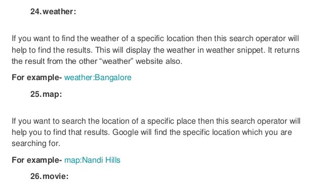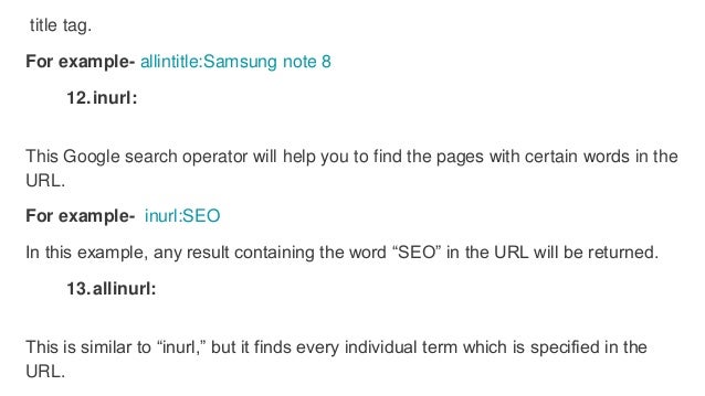 Googles basic search operators help filter the results you get from your search. Basically they are the shortcuts of getting a specific and accurate result. In case youd only prefer to know about a specific folder or subdomain just include either.