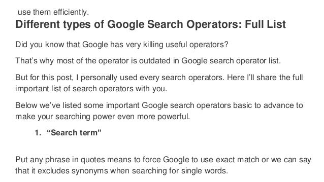 Googles help no longer lists most of them edited in april 2019 google introduced the operators before. Get the boolean basics class for extensive coverage of all things boolean. Thats why most existing lists of google search operators are outdated and inaccurate.
