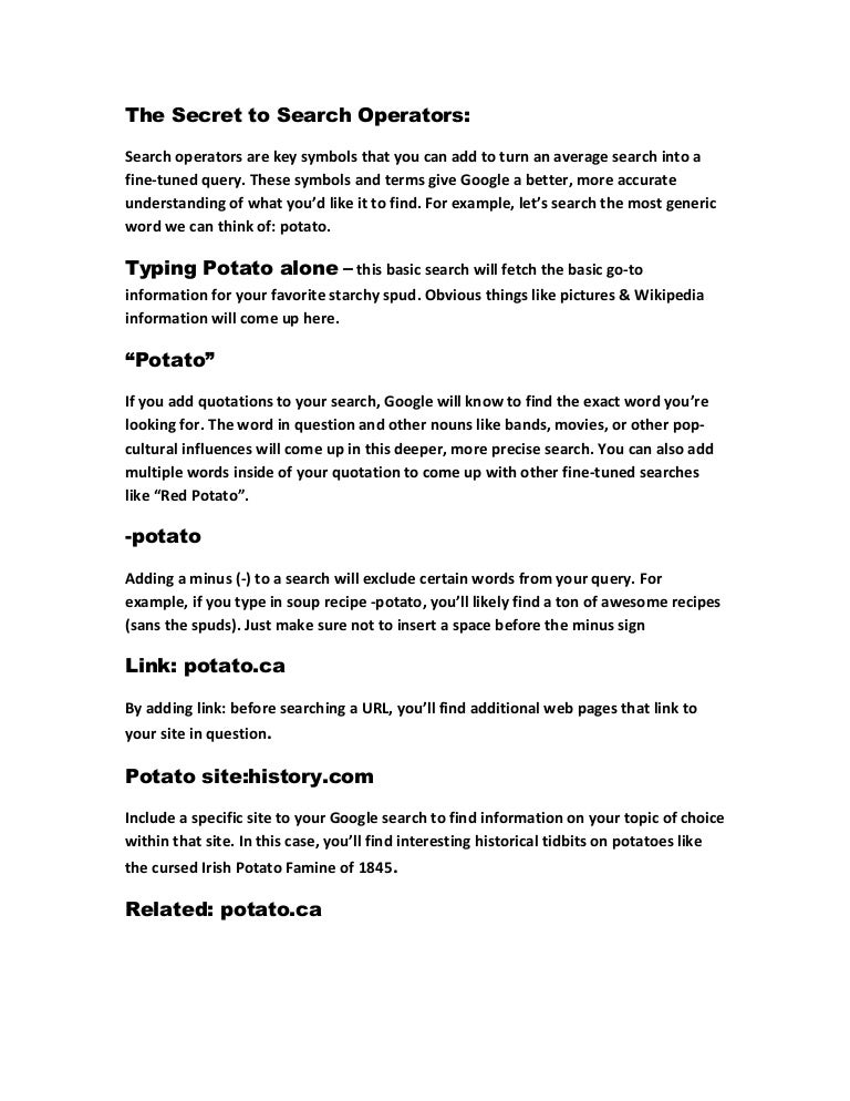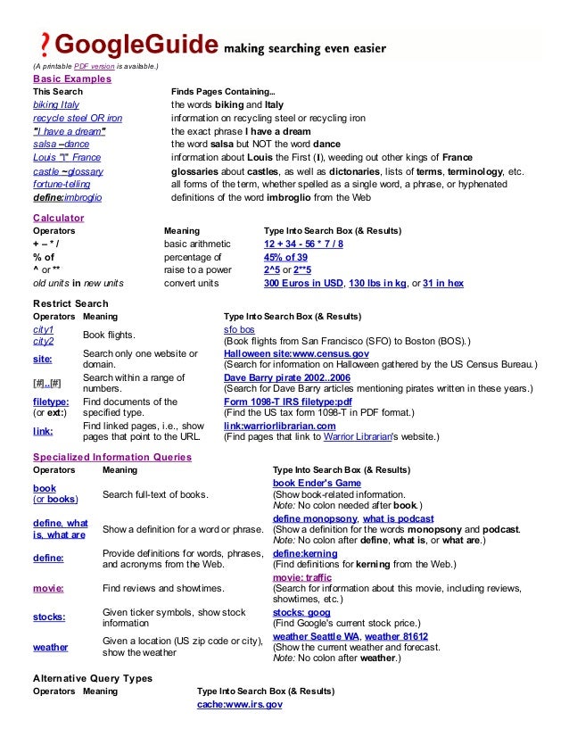Google search operators pdf. The following is an alphabetical list of the search operators. For this post i personally tested every search operator i could find. They can deliver great insights when it comes to analyzing websites for seo.