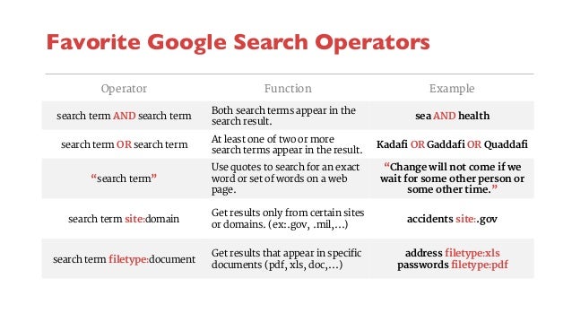 Using search operators for your research is almost as old as search engines are. Each entry typically includes the syntax the capabilities and an example. Use le type to search for specic les like xml jpeg or pdfs.