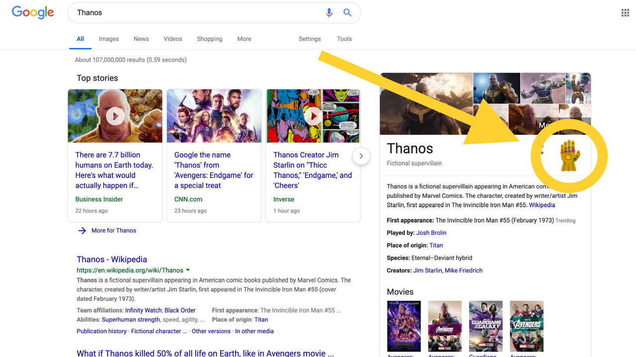 But since google obfuscate their code its a little bit hard to see the technique they used. In the search results you will be able to see the infinity gauntlet in the search card on the right side beside the name thanos. And no dont worry this is not a.