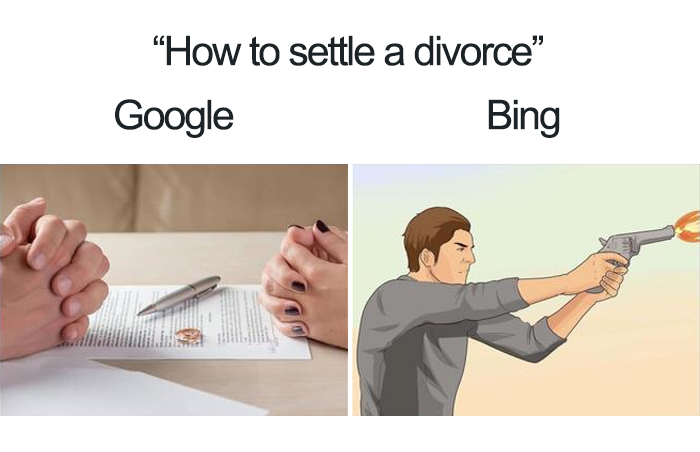 The memes present bing as a search engine that would interpret the request in a straightforward way and present respective results while google would first show results that could dissuade the. Google with those on microsofts lesser known platform. Bing memes compare the search results on the most popular search engine in the world.