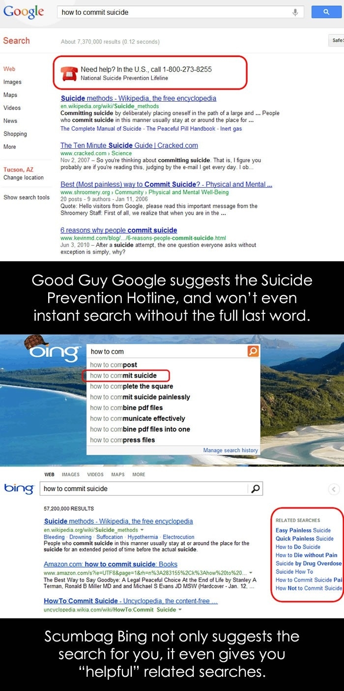 Thus a topic that is in no way funny became a hilarious meme format that people cant get enough of so bored panda has compiled for you a list of 20 hilarious google vs. While google pulls up suicide hotlines first bing shows you the most efficient way to end things. Compared to googles spartan interface bing feels more colorful and inspirational.
